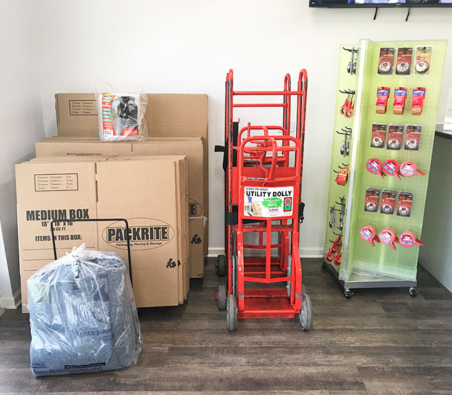 Boxes in all sizes, packing tape, stretch film, moving blankets, furniture covers, dish kits, and tie-down products available at all facilities.