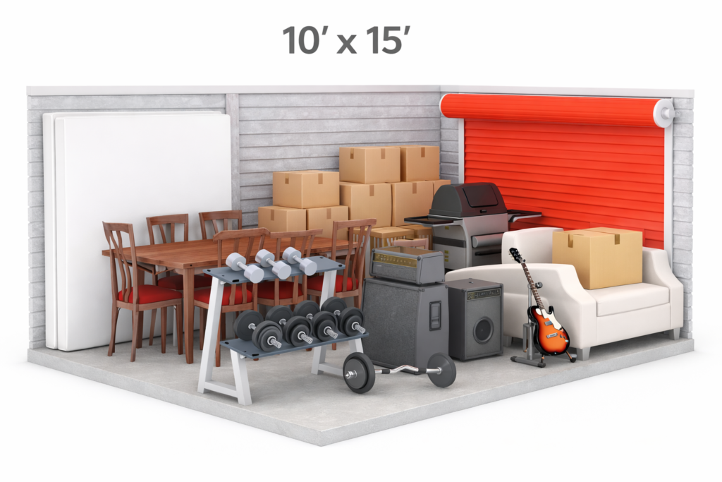 For larger homes or apartments, the 10×15 unit is an excellent choice. It provides the extra space needed for storing multiple rooms’ worth of furniture, including larger furniture like dining tables and couches, as well as larger appliances, electronics, and personal items. This unit can accommodate the contents of a two-bedroom apartment comfortably.