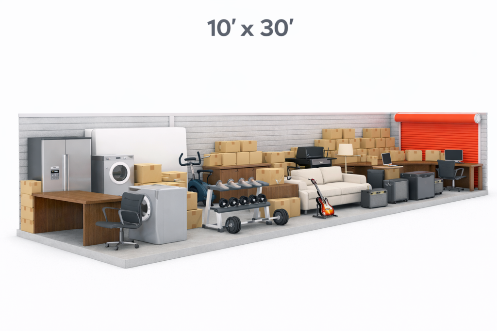 Ideal for storing the contents of a large multi-bedroom home or even a small business inventory. The 10×30 unit offers vast space for larger storage needs, whether you’re moving, downsizing, or need long-term storage for a variety of large items, including multiple vehicles, large furniture, or business equipment.
