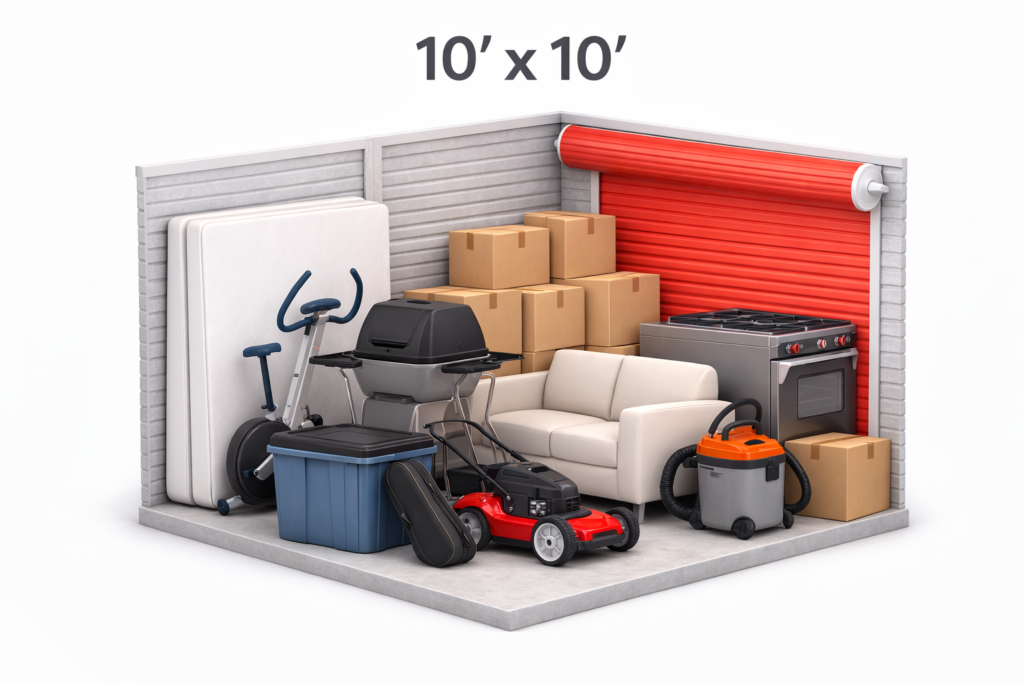 A 5×10 unit is a perfect size for storing the contents of a small bedroom or studio apartment. You can store furniture like a couch, mattress, or coffee table along with several boxes. It’s a great choice for those looking to store a mix of small furniture, electronics, and personal belongings during a move or home renovation.